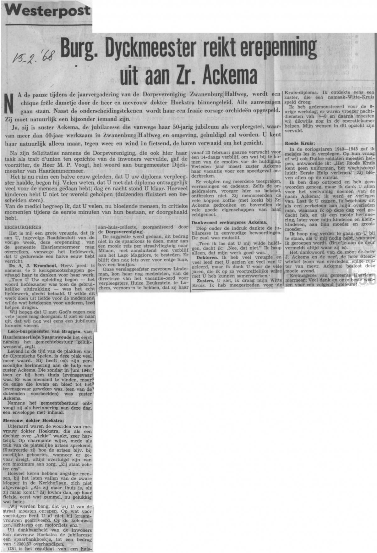 Burgemeester Dyckmeester reikt erepenning uit aan zuster Ackema