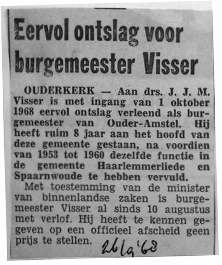 Eervol ontslag JJM Visser burgemeester Haarlemmerliede en Spaarnwoude 1953-1960