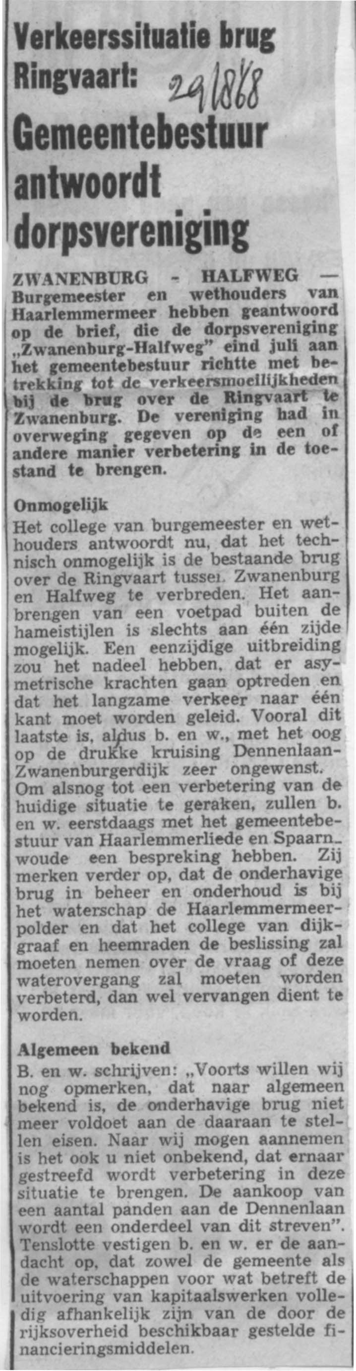 Gemeentebestuur antwoordt Dorpsvereniging over brug Ringvaart