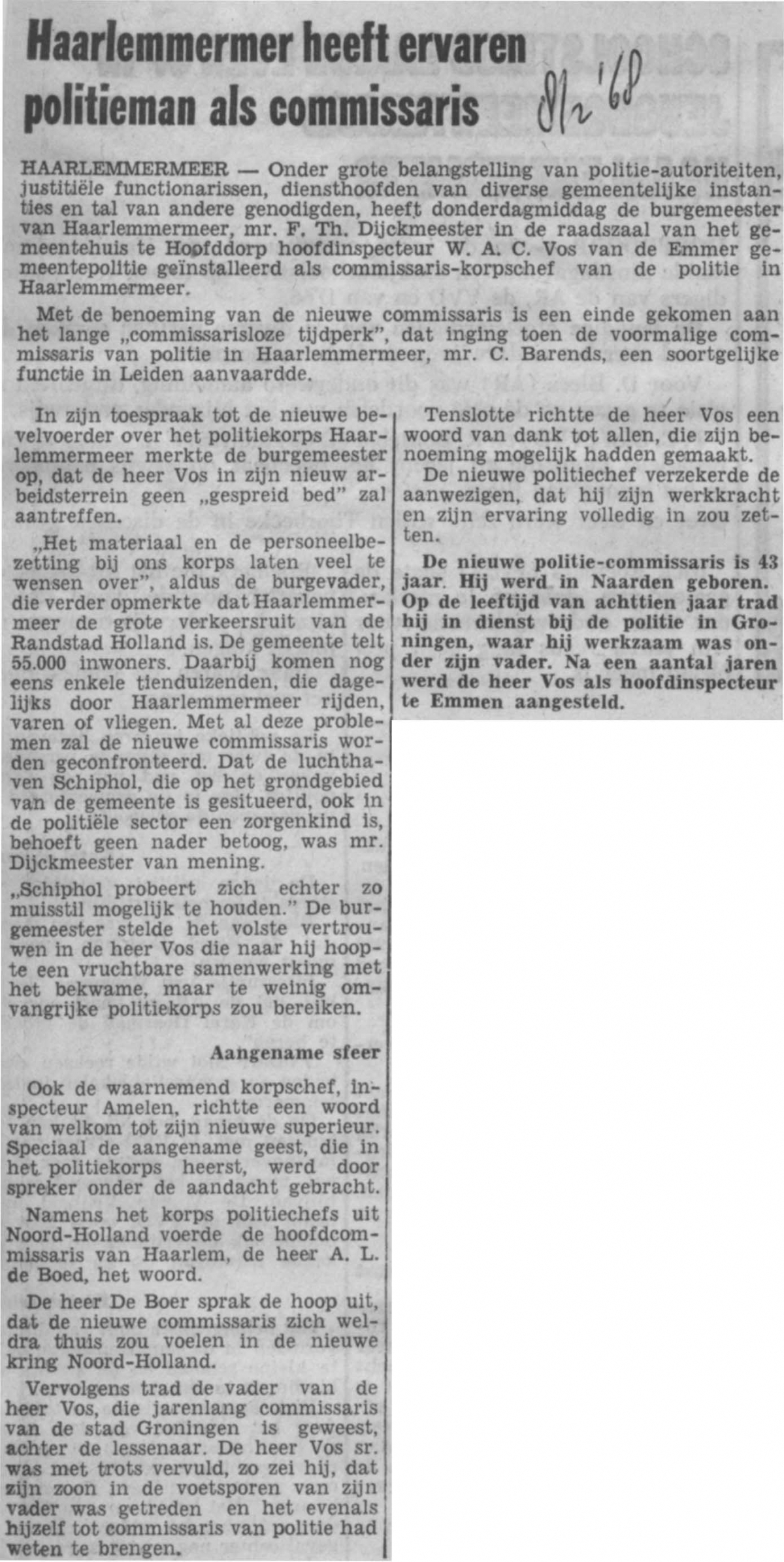 Haarlemmermeer nieuwe politiecommisaris Vos