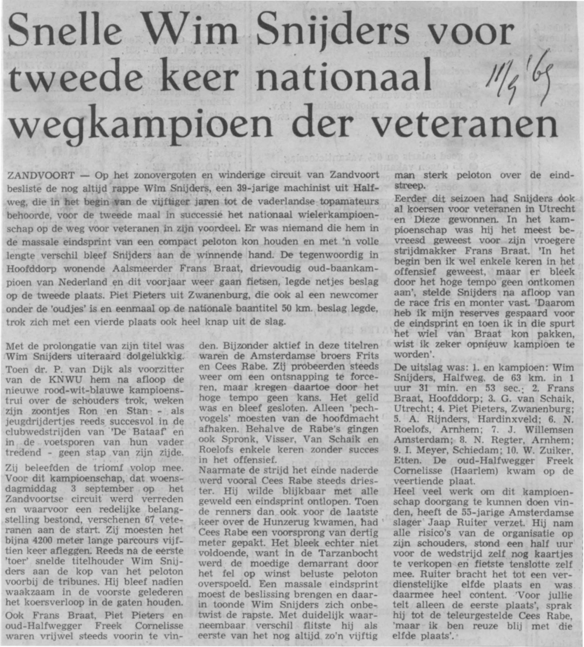 Wim Snijders weg kampioen wielrennen der veteranen