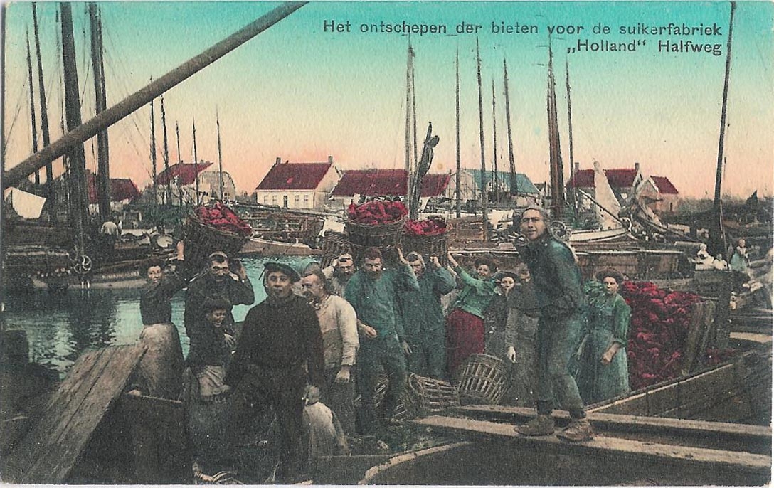 Suikerfabriek. ontschepen van de bieten, ca. 1910