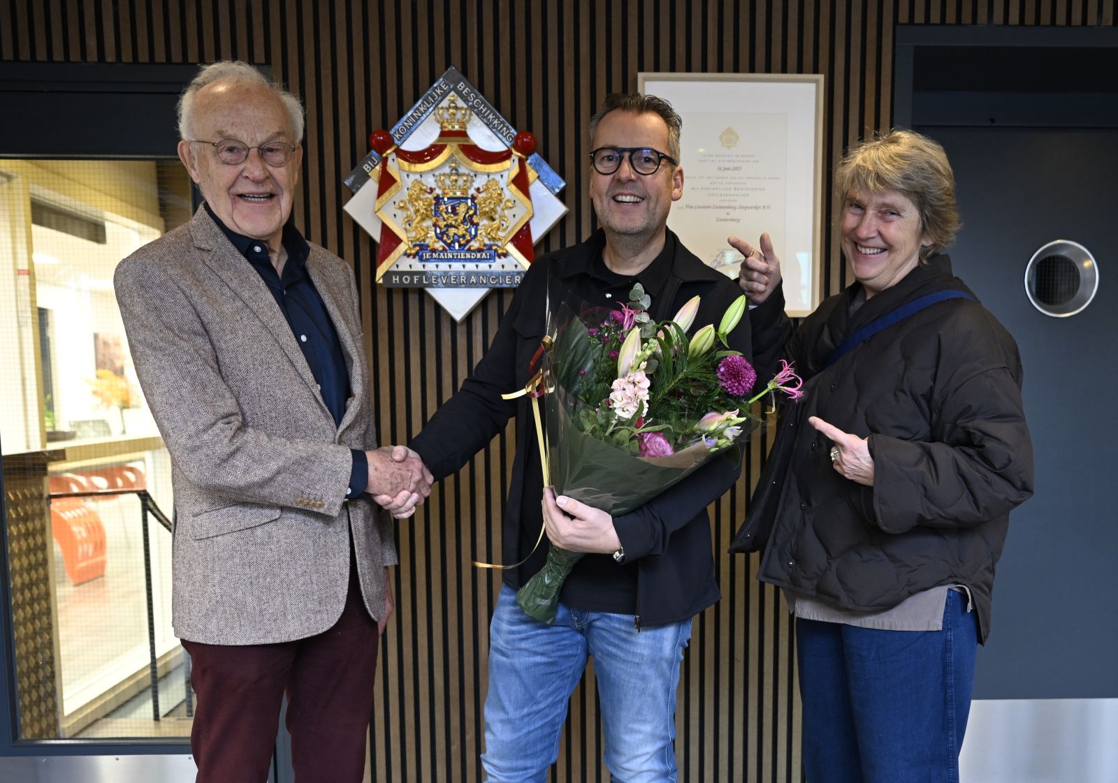 Na een fotomoment onder het wapenschild “Hofleverancier” was het tijd voor koffie waarbij voorzitter André van der Veen het woord nam. “Wij zijn hier ter gelegenheid van het feit dat jij de 500ste donateur bent”, zo begint van der Veen. Het is ook heel bijzonder dat juist Marcel van Leeuwen dit is geworden. Immers het gelijknamige sloopbedrijf bestaat dit jaar 125 jaar, dat is in oktober uitbundig gevierd. Toen is ook het predicaat “Hofleverancier” uitgereikt door burgemeester Marianne Schuurmans. “Voor ons als Historisch Halfweg is het ook bijzonder dat duurzaamheid binnen jouw bedrijf zo’n grote rol speelt”, zo vervolgt André. Hij ziet ook wel een aansluiting tussen zijn bedrijf en de werkzaamheden van Historisch Halfweg. Marcel geeft aan dat hij al van jongs af aan betrokken is geweest bij de historie van Halfweg en Zwanenburg door middel van de boekjes “Zwanenburg in oude ansichten” die in de jaren 70 van de vorige eeuw werden uitgebracht door Cor Lücke. Marcel schetst vervolgens in het kort de geschiedenis van zijn bedrijf dat 125 jaar geleden is gestart in Rotterdam. Het bedrijf heeft een interessante ontwikkeling doorgemaakt. Zo zijn zij momenteel marktleider om binnen 16 uur het casco op te leveren van een supermarktlocatie. Dat illustreert hij aan de hand van een promotiefilm. Bij het afscheid vraagt André van der Veen of leden van de werkgroep nog eens langs mogen komen om een artikel te wijden aan de historie en ontwikkeling van het bedrijf. “De deur staat altijd open en de koffie is klaar”, antwoordt Marcel.
