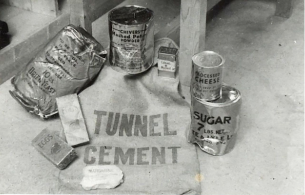 Een jutezak en blikken met voedsel die duidelijk de sporen van de dropping dragen (Noord-Hollands Archief, Haarlem).
